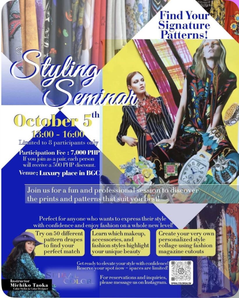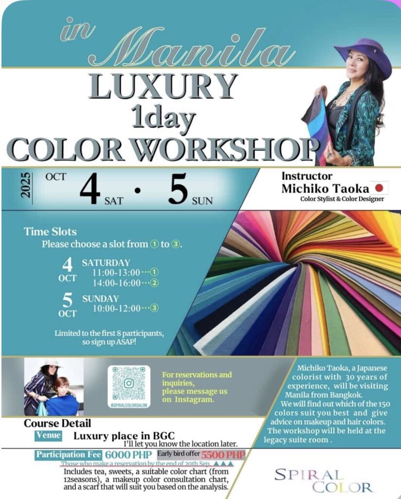 Led by renowned Japanese color analyst Michiko Taoka — with 30 years of experience and over 12,000 personal color analyses — this session will reveal your most flattering colors and elevate your personal style.